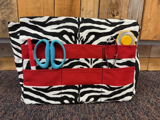 This little caddy holds all your necessary sewing notions in one handy, very portable little case! There's room for scissors, a tape measure or ruler, seam ripper, pen, needles and pins, buttons and snaps, and thread bobbins. Perfect for mending or taking to sewing or quilt classes, even handy for travel. Load it up and you're ready to go!